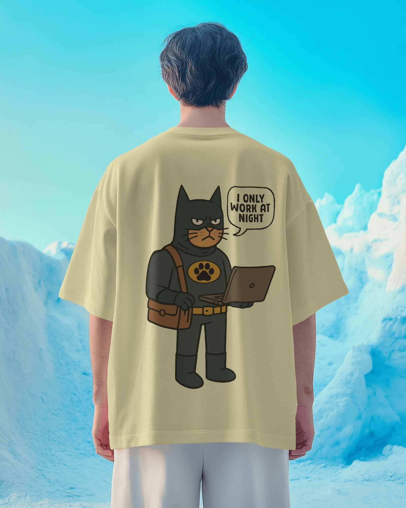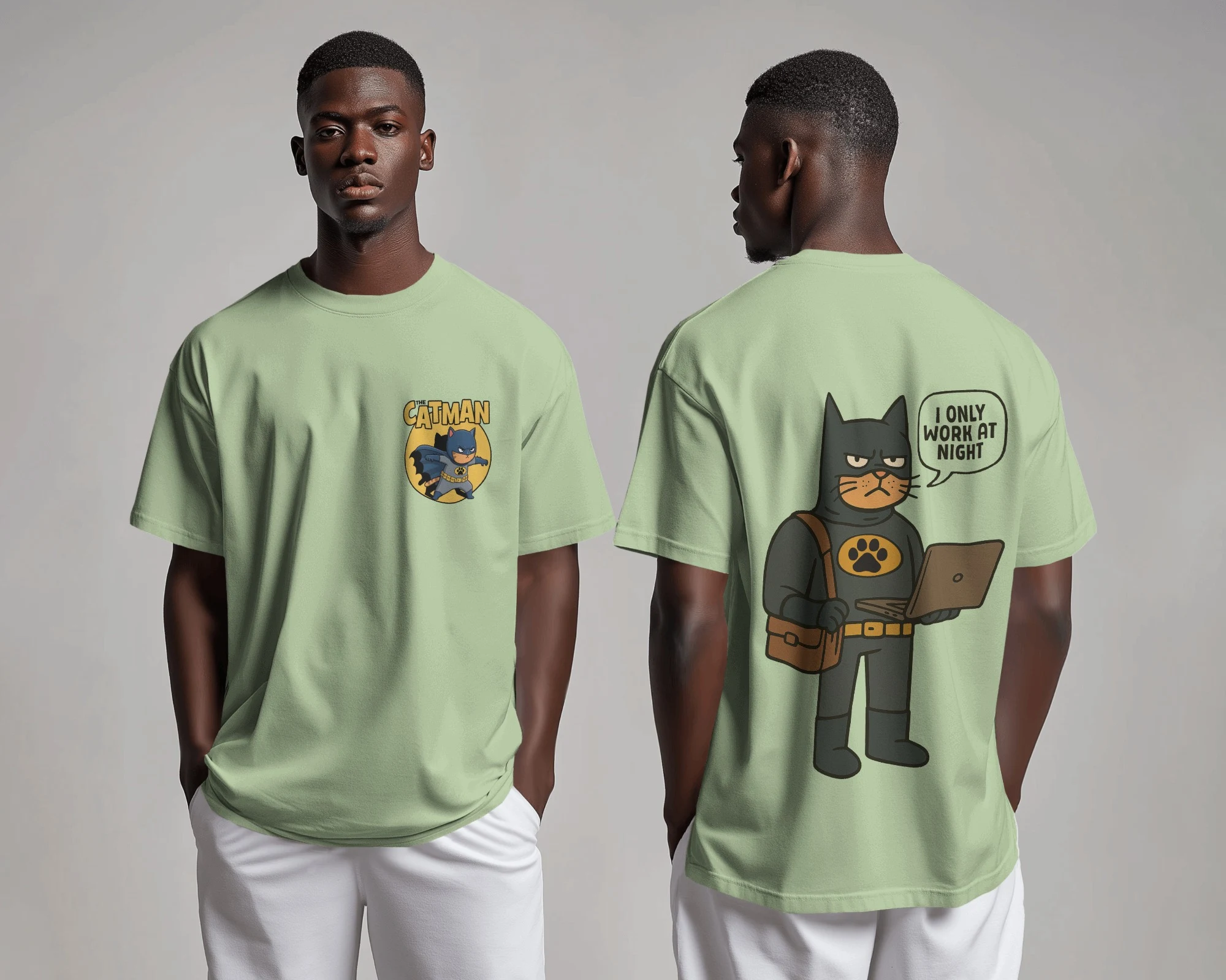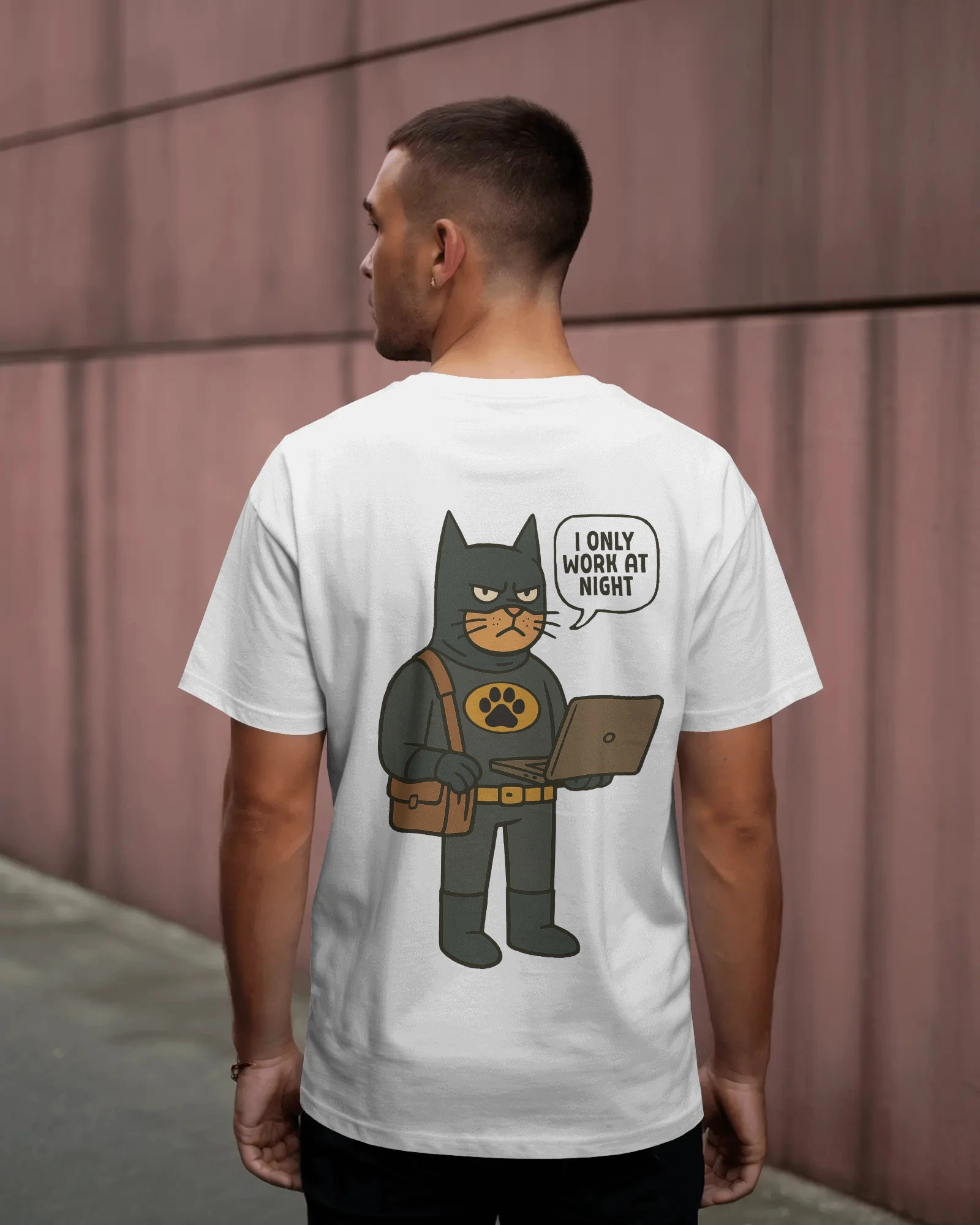The Catman Night Shift Tee features a playful comic-style Catman on the front and a bold back print reading “I Only Work at Night.” Fun, quirky, and stylish—perfect for night owls, gamers, coders, and anyone who thrives after dark.