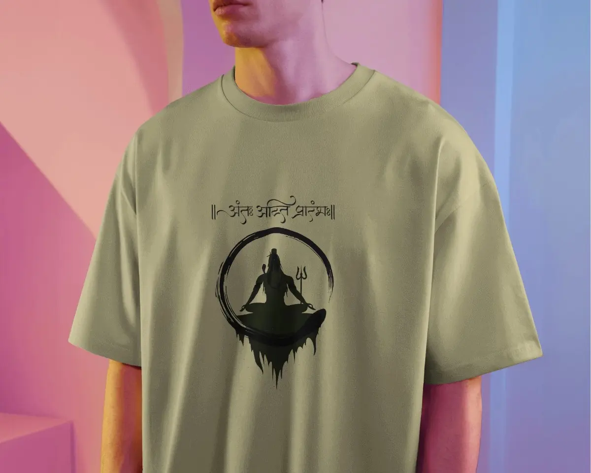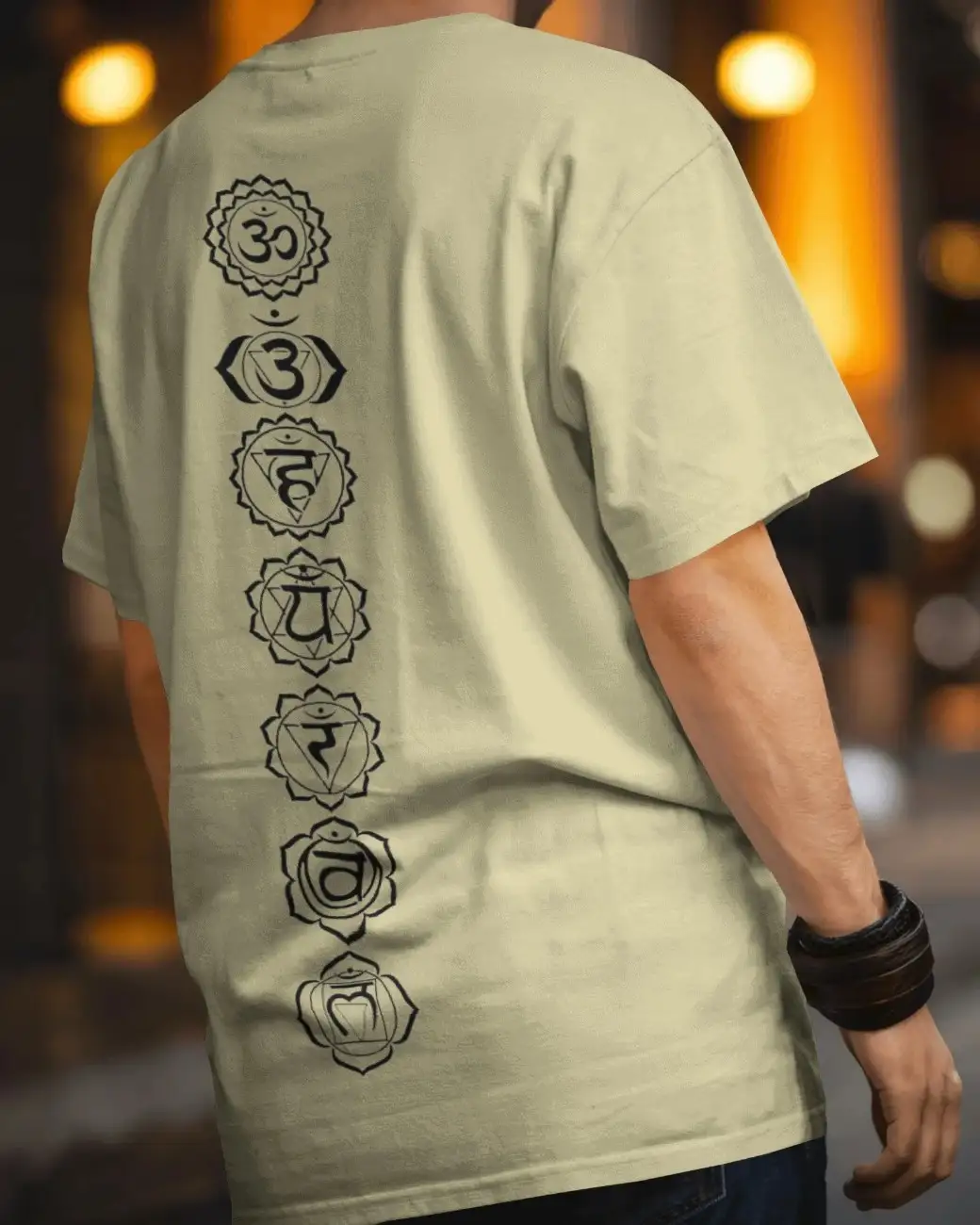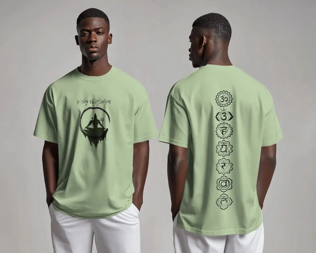 Channel divine energy with the Mahadev Chakraflow Tee — where stillness meets flow. The front features a bold silhouette of Lord Shiva in deep meditation, encircled in cosmic brush strokes, radiating timeless power. Above him, a sacred Sanskrit mantra invokes peace and higher consciousness. On the back, the seven chakras align along the spine, symbolizing spiritual awakening from root to crown.
