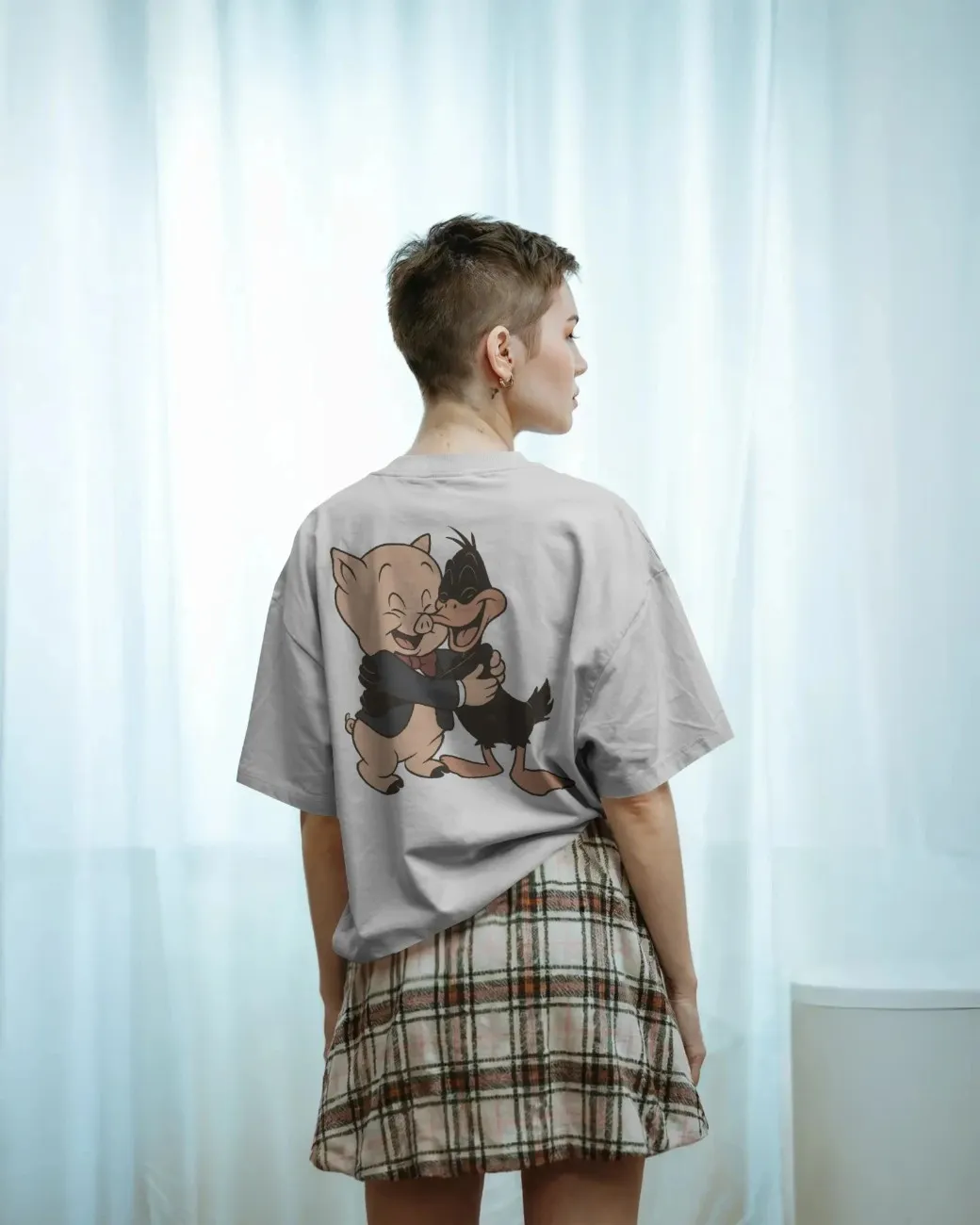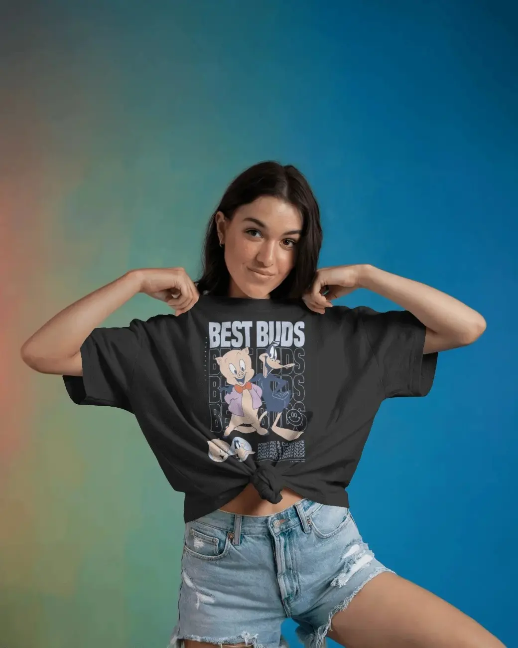 Celebrate classic cartoon friendship with this nostalgic and heartwarming design! Featuring Porky Pig and Daffy Duck sharing laughs and hugs, the front of the shirt proudly states “Best Buds” in bold, layered lettering. The back continues the love with a charming illustration of the two characters in a joyful embrace. Perfect for fans of retro animation and anyone who values timeless friendship with a playful twist.