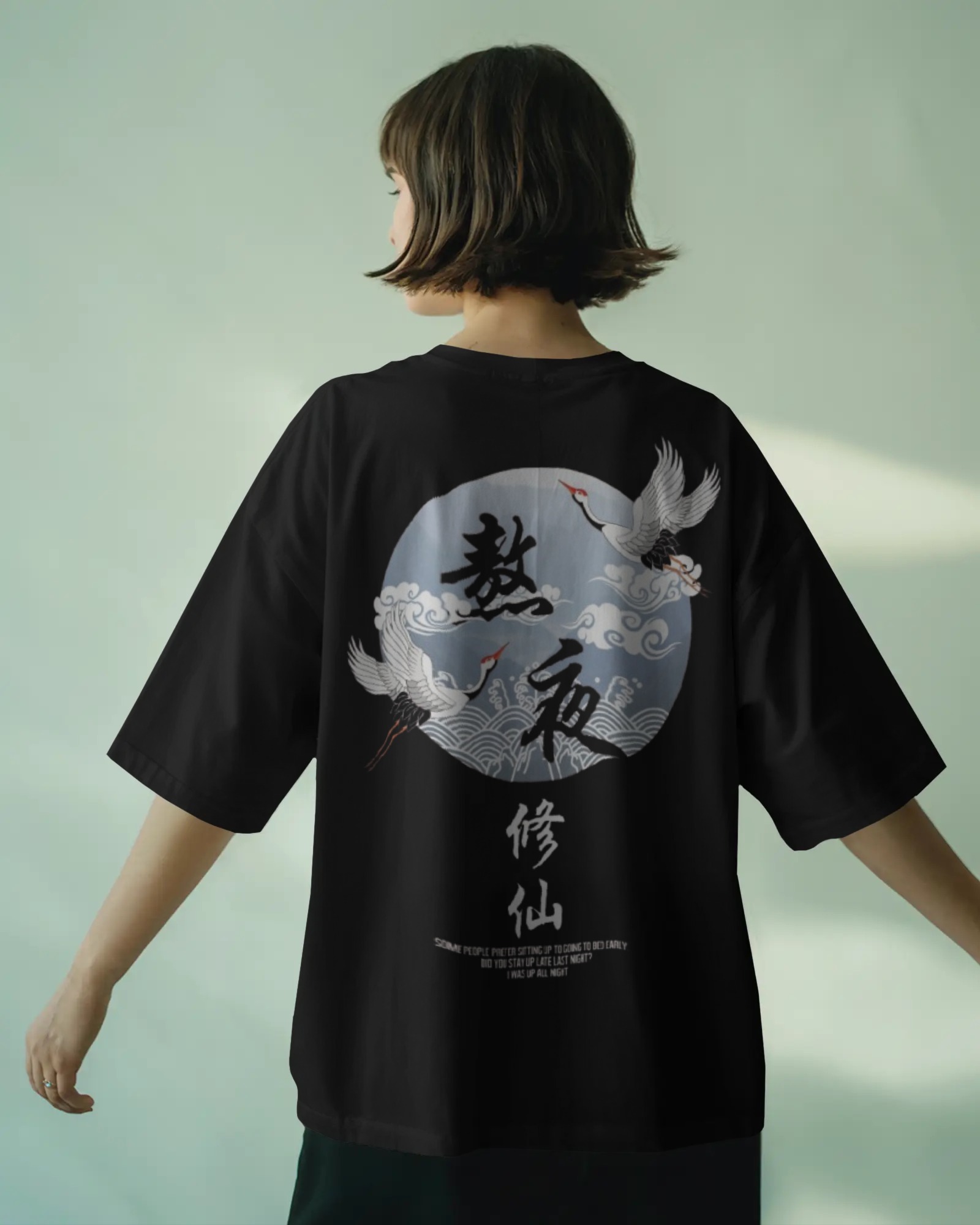 Embrace elegance and symbolism with the Celestial Cranes Tee. This oversized T-shirt features a stunning front graphic of two ethereal cranes mid-dance, encircled by stylized clouds and a subtle crescent—an homage to harmony, peace, and longevity in East Asian art. The back design expands the narrative, depicting a full moon rising among swirling clouds and soaring cranes, alongside bold Chinese calligraphy.