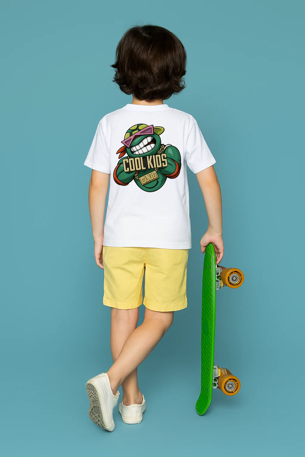 A fresh and playful T-shirt designed for young trendsetters. The front boasts a bold “COOL KIDS CLUB” graphic with a grinning, shades-wearing character full of attitude, while the back features a sleek, badge-style version of the same cool mascot. Perfect for skateboarding, hanging out, or just showing off style, this tee blends vibrant colors with a confident, street-smart vibe.