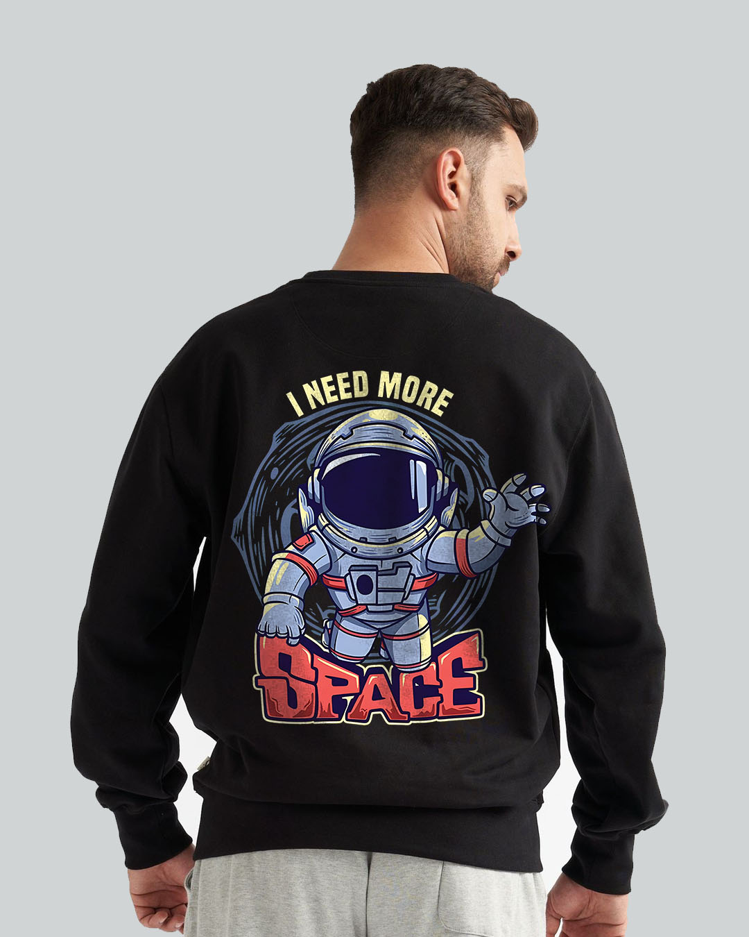 A fun and vibrant space-themed crewneck designed for dreamers and adventurers. The back features a bold cartoon astronaut reaching out from a swirling cosmic portal with the playful phrase “I Need More Space.” The front keeps it clean with a colorful astronaut helmet graphic and the word “SPECTRA,” adding a futuristic vibe. Perfect for anyone who loves space, sci-fi art, and standout cosmic style.
