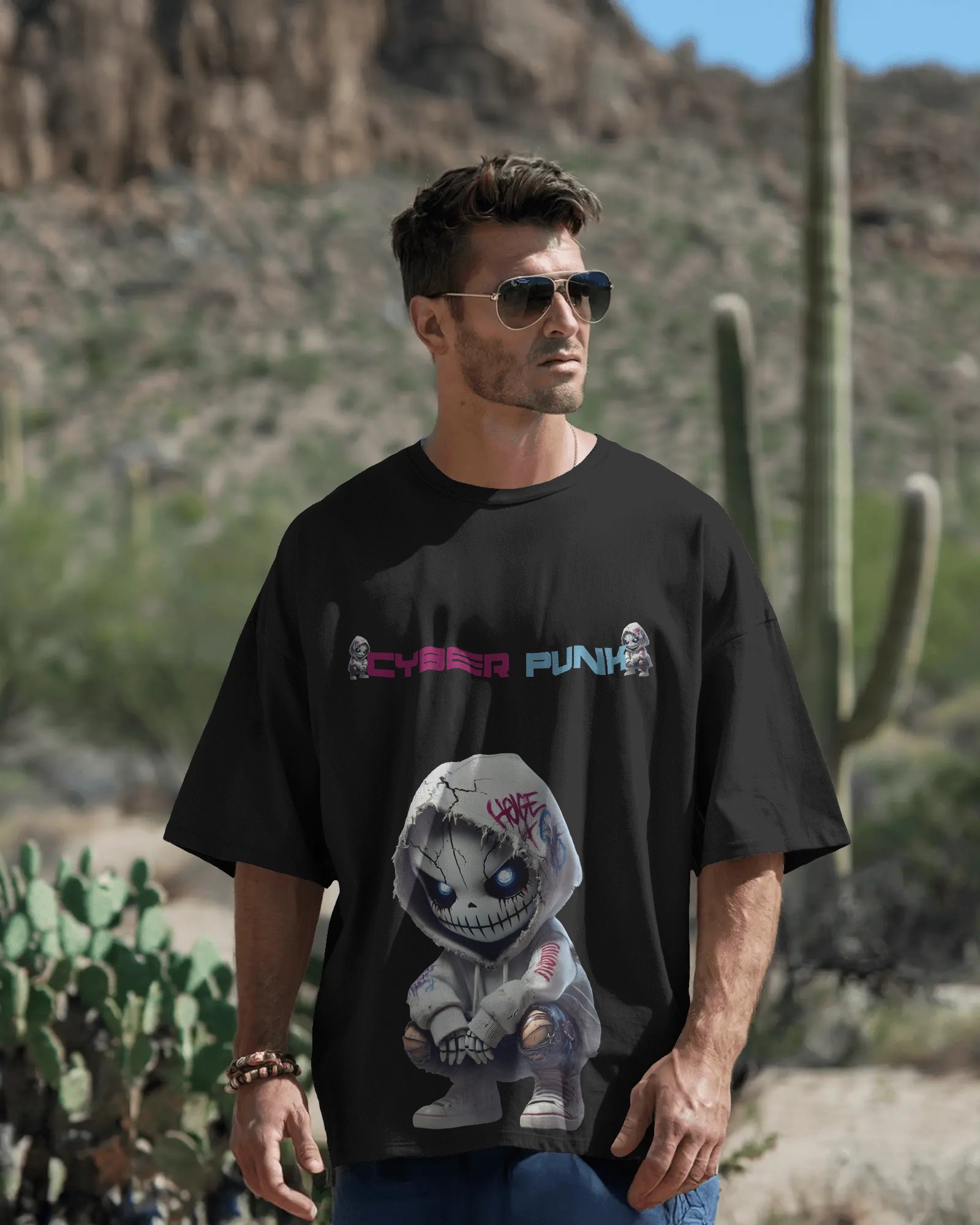 A bold oversized tee featuring a cracked, graffiti-tagged cyberpunk character with glowing blue eyes. The design blends urban street art with futuristic grit, highlighted by the “CYBER PUNK” text across the chest. Perfect for those who love edgy, rebellious streetwear with a touch of dystopian flair.