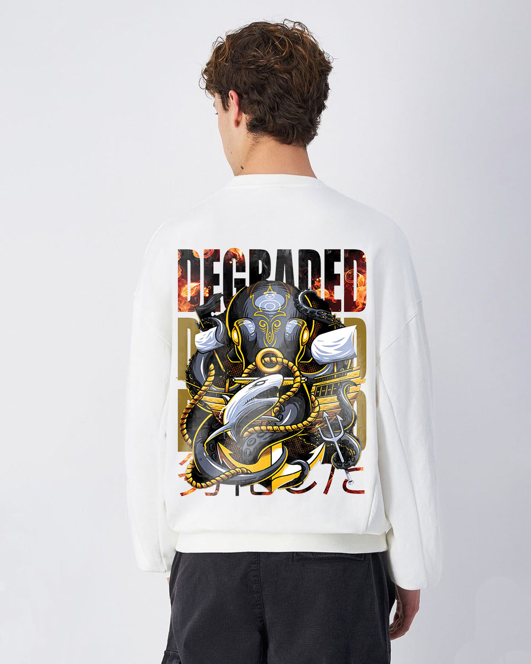 A bold fusion of cyber-mythology and street fashion. The back features an intense mech-inspired god design wrapped in cables, armor, and futuristic details, set against fiery DEGRADED typography for a powerful visual punch. The front keeps it clean yet edgy with a refined cut-out text design paired with Japanese characters. A perfect pick for fans of mech art, cyberpunk aesthetics, and statement-making streetwear.
