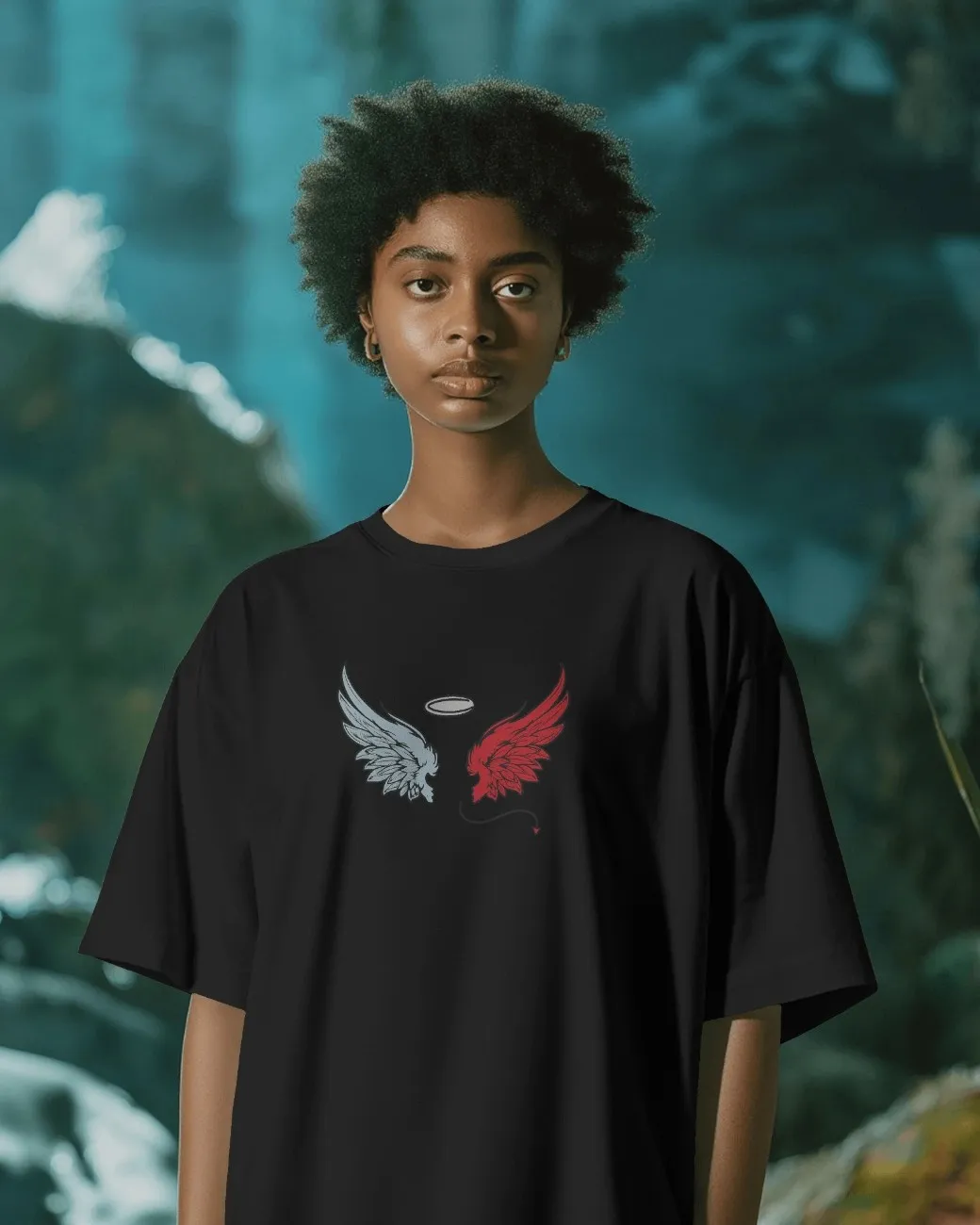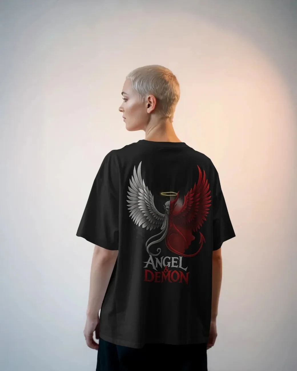 Divine Rebellion is an oversized t-shirt that captures the eternal conflict within — the battle between light and darkness, good and evil, order and chaos.Crafted for those who live in balance — or teeter on the edge — this t-shirt is for the rebels with a conscience, the angels with scars, and the demons with a heart. A true streetwear statement of identity, contrast, and power.