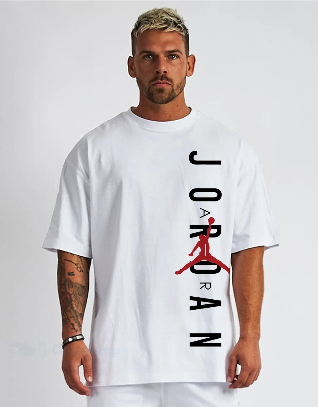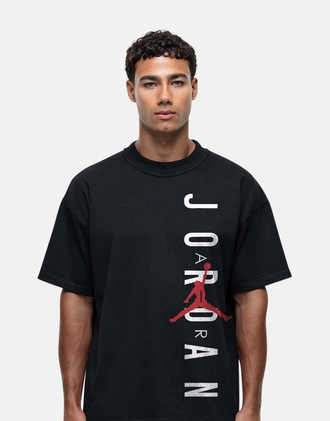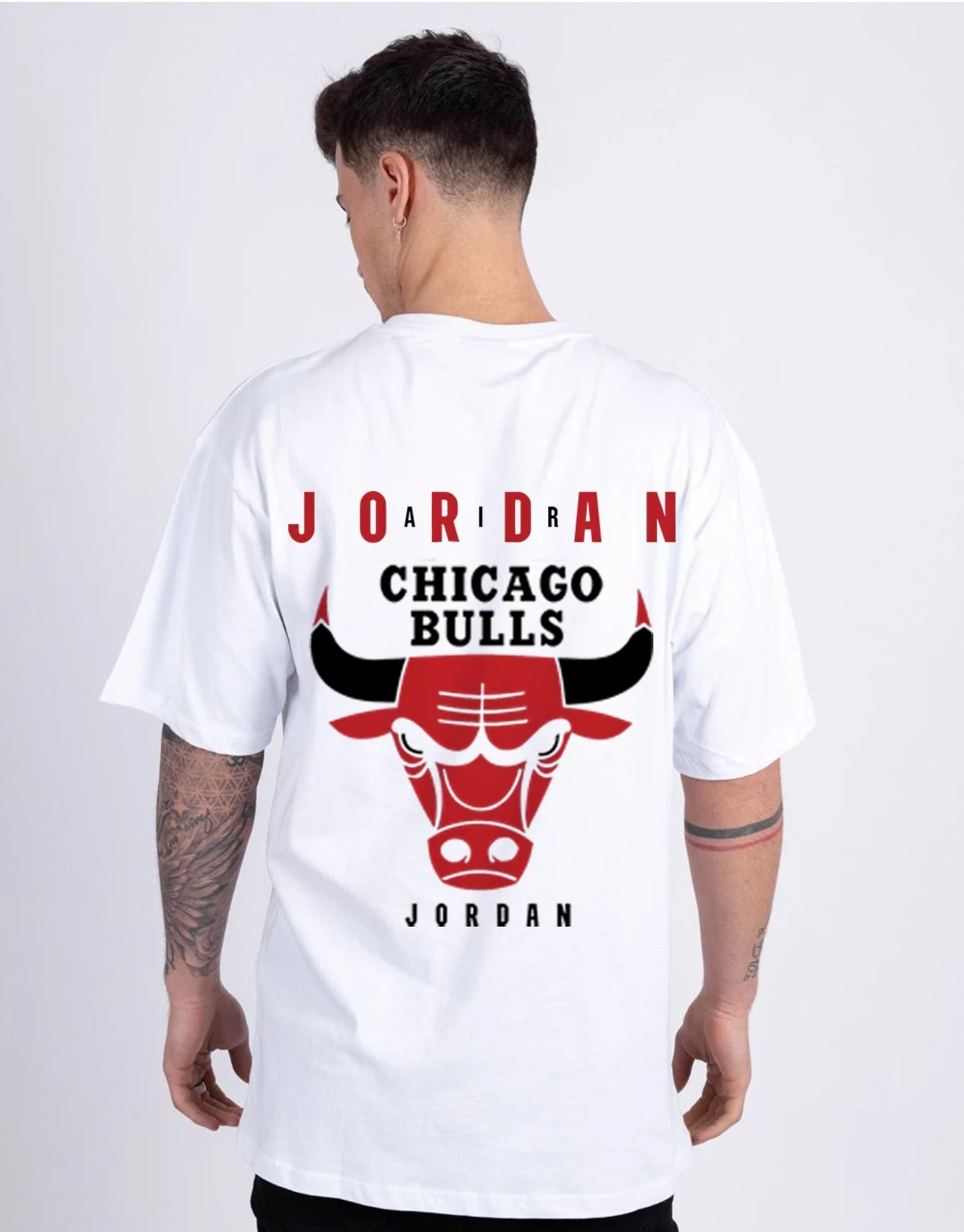 Step into iconic streetwear style with the Jordan Bulls Legacy Tee. This oversized white T-shirt features bold vertical "JORDAN" lettering on the front with the classic Jumpman logo, giving it a sleek and sporty vibe. On the back, the striking Chicago Bulls logo takes center stage, paired with "CHICAGO BULLS" typography and Jordan branding, celebrating the legendary connection between Michael Jordan and the Bulls.