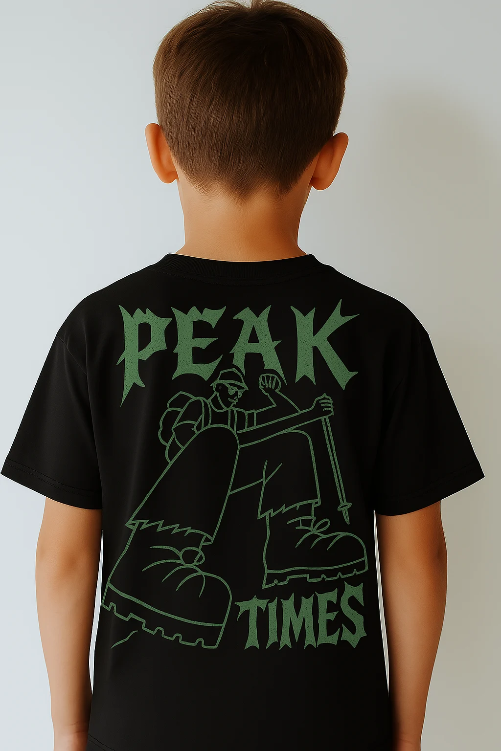 A bold streetwear-inspired kids’ T-shirt that fuses adventure with attitude. The front features a striking “MAMMOTH” graphic in edgy, claw-like typography, while the back showcases an oversized hiking figure beneath the powerful “PEAK TIMES” slogan, symbolizing strength, exploration, and reaching new heights. Perfect for young trendsetters who love the outdoors and want to make a statement.