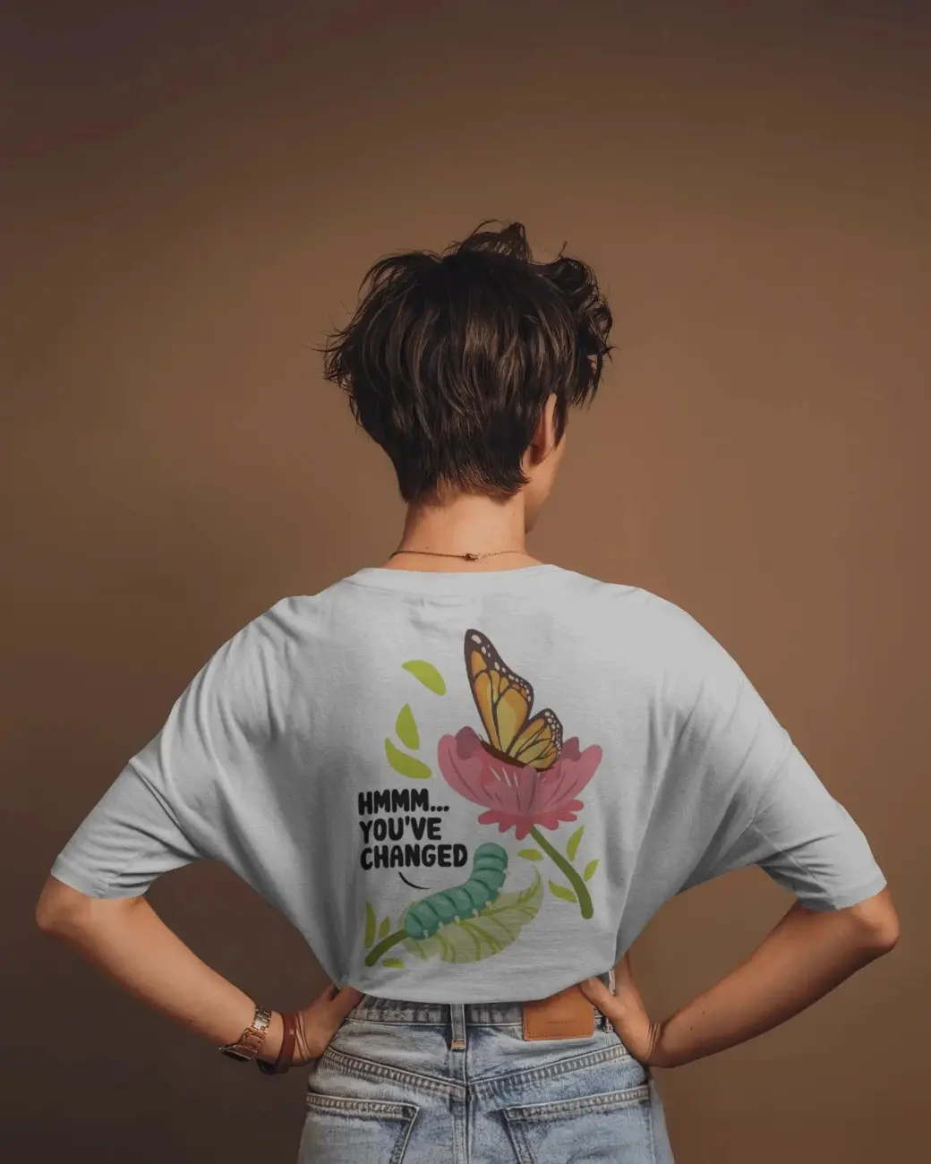 This artistic tee captures the beautiful journey of transformation—from a curious caterpillar to a graceful butterfly. The front design showcases the life cycle in a dreamy, pastel palette with the word "MAMMOTH" anchoring the theme of growth and strength. On the back, the whimsical text "HMMM... YOU'VE CHANGED" adds a touch of humor and reflection, paired with an elegant butterfly emerging beside its former self.