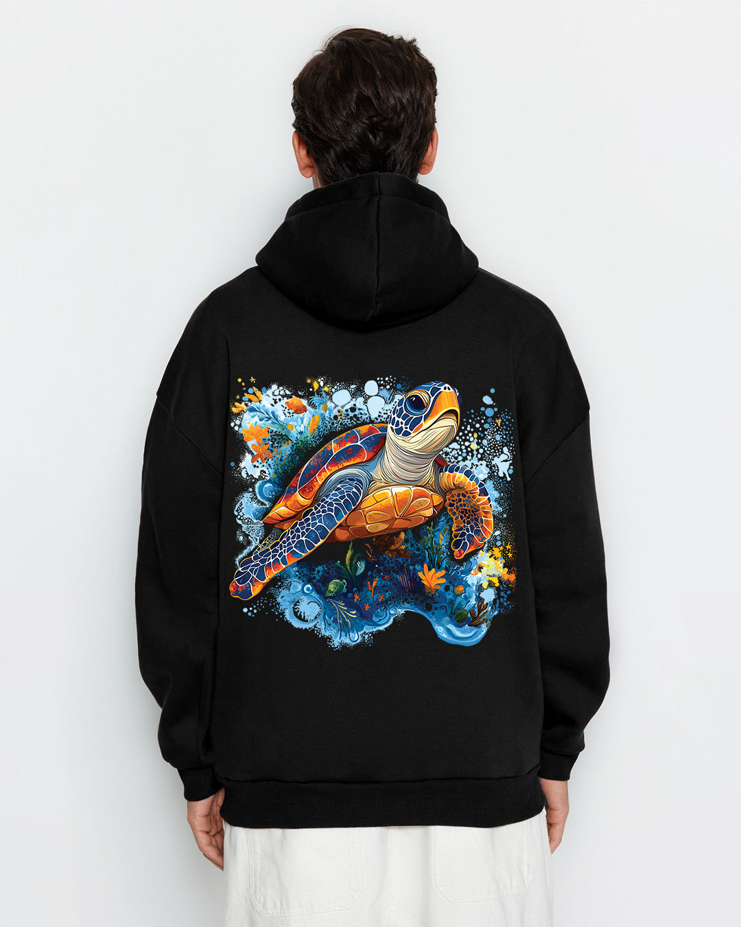 A vibrant ocean-themed hoodie celebrating peace, freedom, and nature. The front features a colorful quote — “And into the ocean I go to lose my mind and find my soul” — surrounded by playful sea-blue accents. The back showcases a stunning, highly detailed sea turtle swimming through a burst of oceanic colors, symbolizing calm, exploration, and inner balance. Perfect for ocean lovers, beach wanderers, and anyone who finds their soul in the sea.