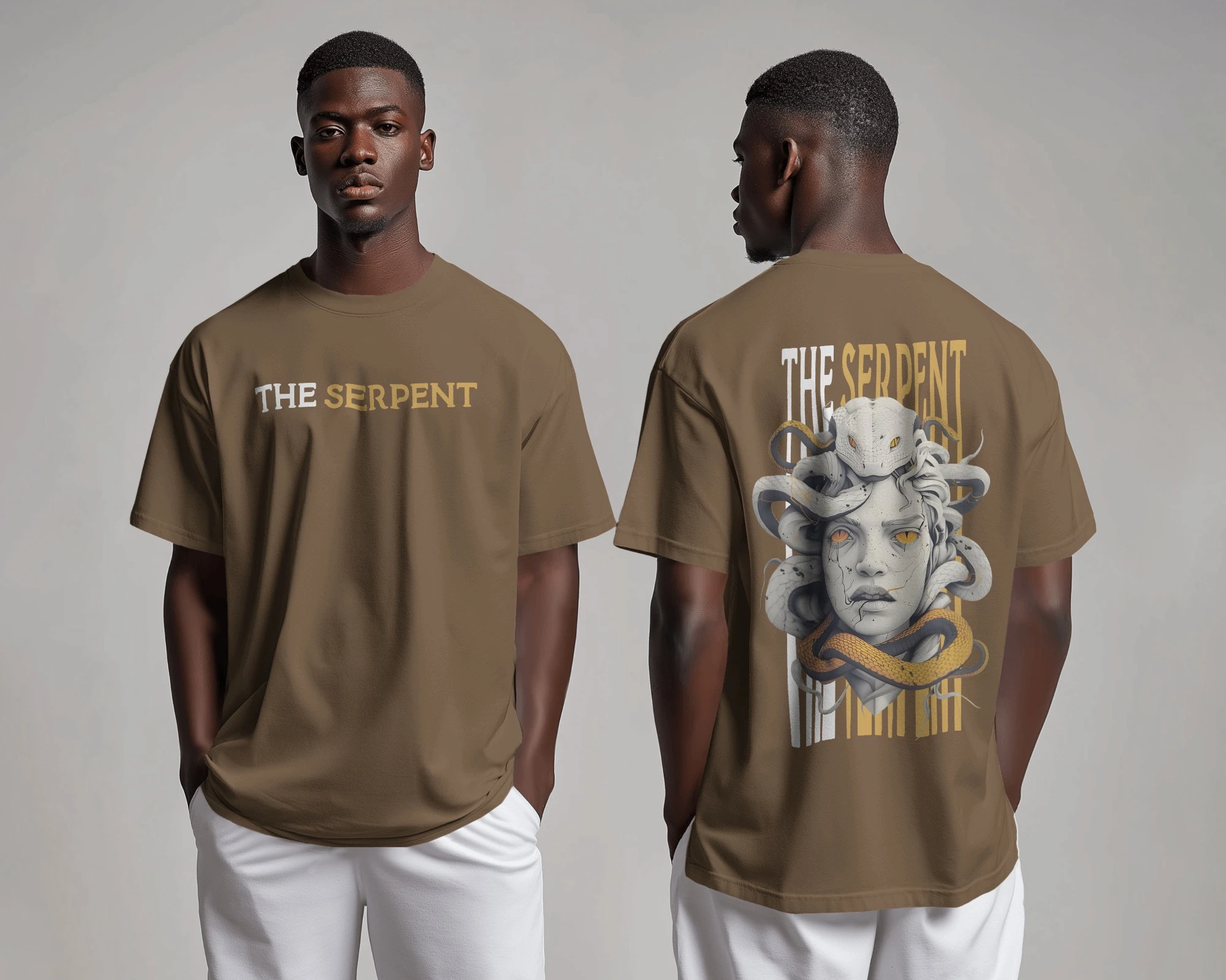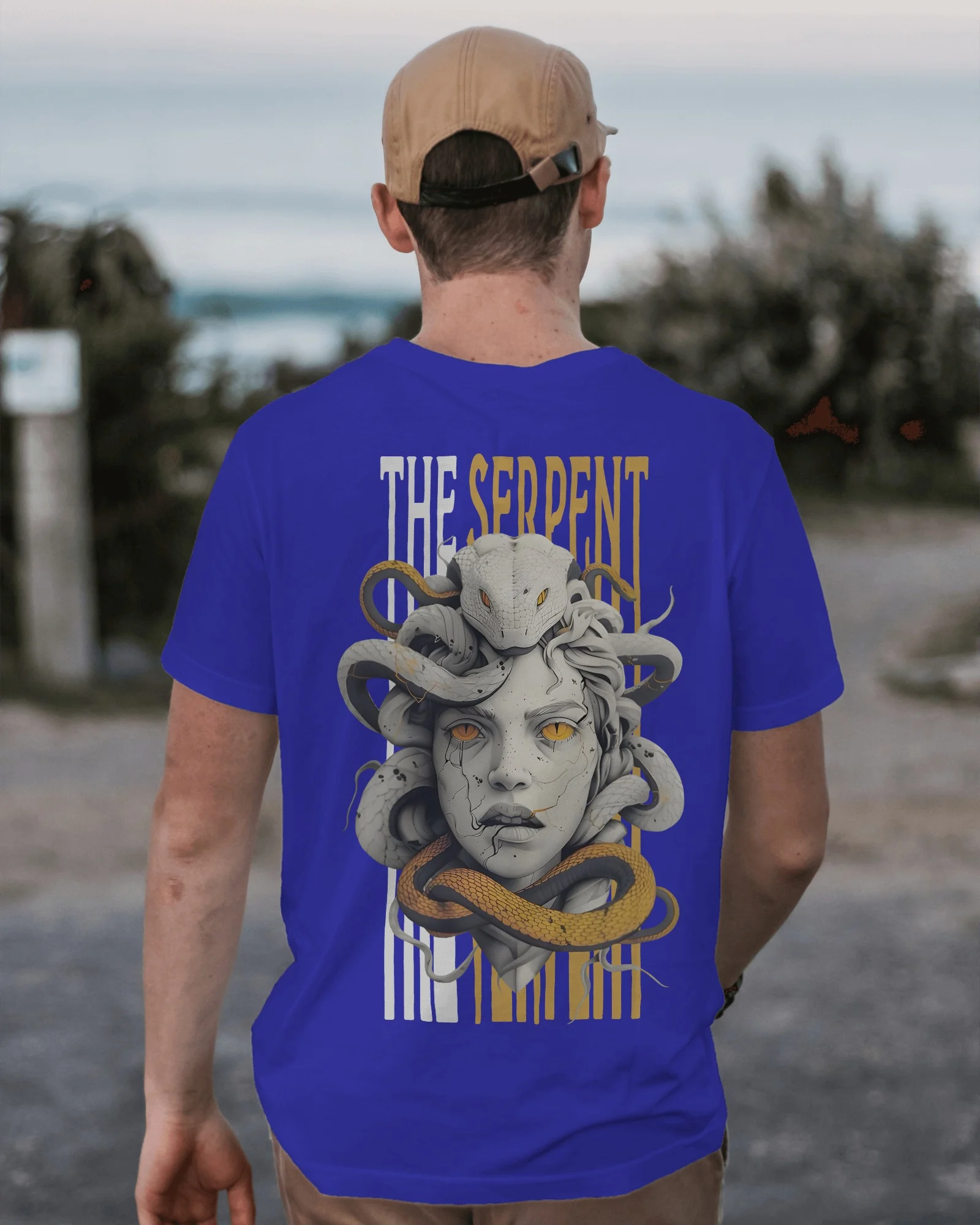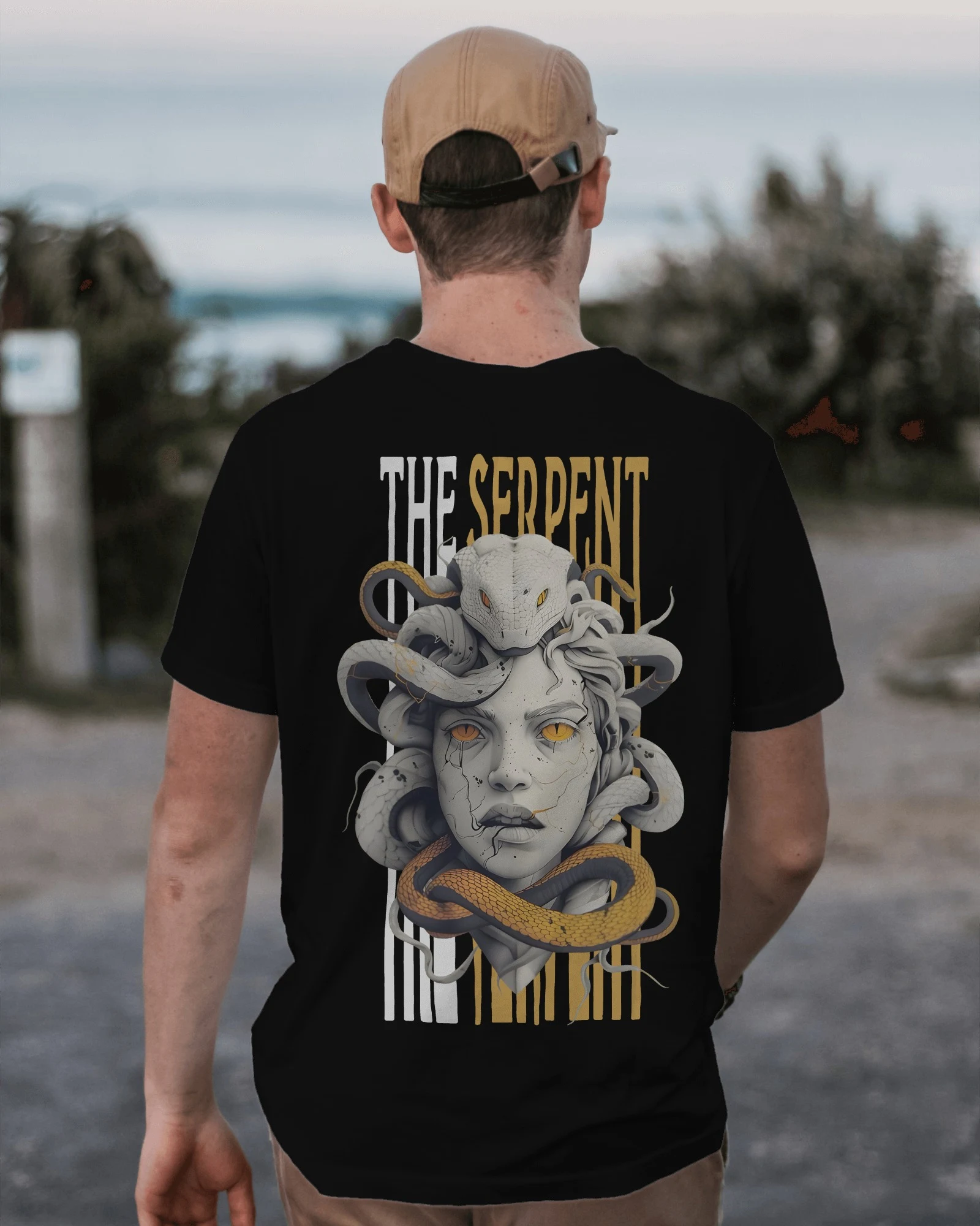 This streetwear tee blends mythology with modern edge. The front keeps it bold and minimal with the text “THE SERPENT” in sharp contrast, while the back steals the spotlight with a striking Medusa-inspired artwork. Snakes intertwine around a stone-like face with glowing eyes, symbolizing power, danger, and transformation. Gold and white accents highlight the design, giving it a premium, eye-catching appeal. Perfect for those who like their style dark, bold, and legendary.