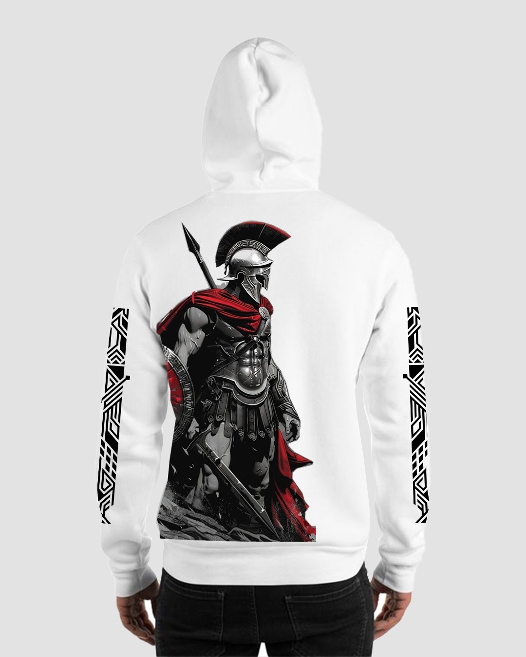 A fierce and commanding design featuring a fully armored Spartan warrior on the back, paired with a bold helmet emblem on the front and tribal patterns along the sleeves. Perfect for anyone who embodies strength, discipline, and warrior spirit in their streetwear style.