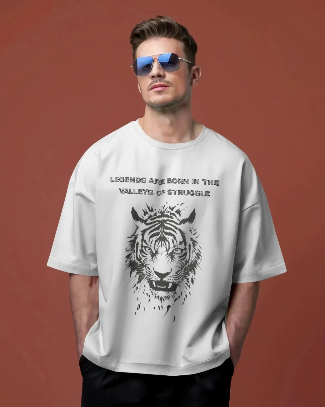 The Valley Born Legend Tee features a fierce tiger graphic and the bold message “Legends are born in the valleys of struggle.” With an oversized black fit, it’s perfect for those who rise from adversity with strength, hustle, and unbreakable resilience.